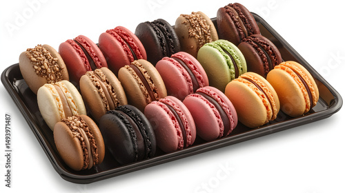 Delightful Assorted Macarons in Vibrant Colors on Elegant Black Tray for Gourmet Dessert