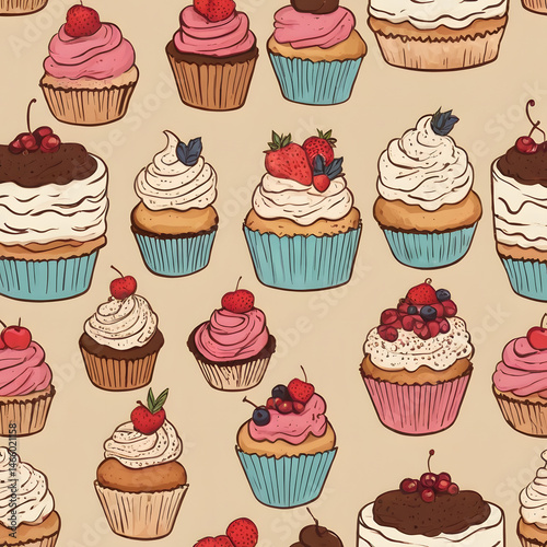 cupcake, cupcake, berry, berry, frosting, cream, dessert, sweet, delicious, food, background, pattern, pastry, baking, cake, confectionery, treat, strawberry, cherry, blueberry, raspberry, chocolate, vanilla, whipped cream, bakery, sugar, pastry, illustration