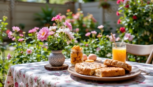 Delightful Breakfast Setting with Cake and Fresh Flowers in a Sunny Garden