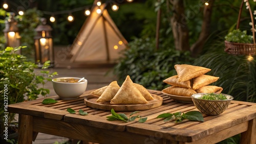 Delightful briouats served on a rustic wooden table under cozy outdoor lights during a charming evening gathering