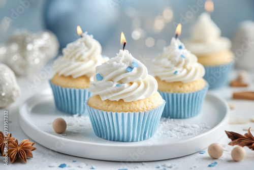 Delightful cupcakes with blue frosting and candles festive dessert table bright and cheerful atmosphere