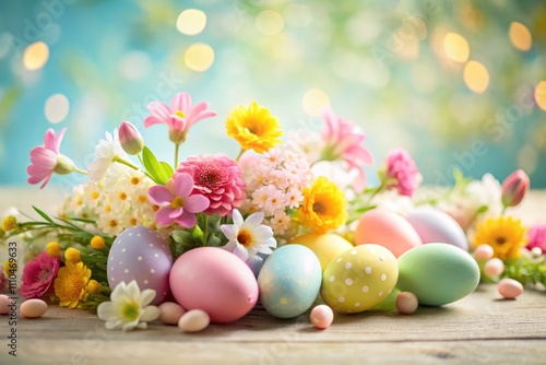 Delightful Easter Composition Featuring Spring Flowers and Colorful Easter Eggs on a Soft Background, Perfect for Celebrating the Joy of Easter with Ample Copy Space