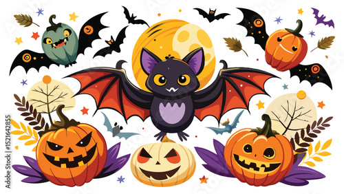 halloween, vector, illustration, pumpkin, bat, bat, skittish, cute, design, cartoon, autumn, holiday, seasonal, greeting, celebration, october, trick or treat, graphic, background, transparent, element, art, decoration, festive, full moon, star, leaf