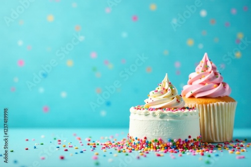 cupcake, cake, sprinkle, colourful, sweet, dessert, bakery, confectionery, delicious, tasty, food, party, celebration, holiday, birthday, sugar, frosting, whipped cream, blue background