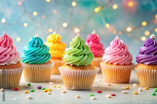 Delightful pastel cupcakes with swirls of frosting, arranged on a table with colorful candy sprinkles, create a festive and joyful mood against a bokeh background
