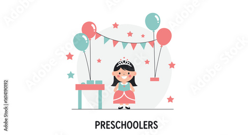 party, girl, children, birthday, princess, balloon, celebration, festive, garland, star, tiara, cheerful, happy, cute, joy, event, decorated, cartoon, character, graphic, illustration, isolated, drawing, childhood, greeting, invitation, kindergarten, preschool, toddler, young, sweet, happiness, funny, holiday, decorate, enjoyment, creative, colourful, playtime, decoration, design, element