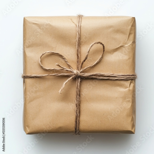 Delightful surprise awaits inside this elegantly wrapped brown package tied with natural twine on a clean white backdrop, perfect for any occasion