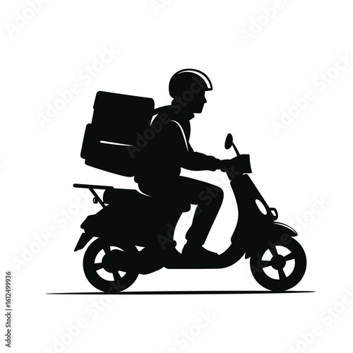 delivery, biker, silhouette, courier, scooter, vector, urban, food, backpack, isolated, white, black, person, job, transportation, helmet, fast, rush, city, outline, shadow, shape, logistic, male, quick, express, cartoon, flat, illustration, minimal, symbol, professional, riding, handlebar, to sit, sleek, pack, move, working, task, active, commute, modern, youth, traffic, stylish, business