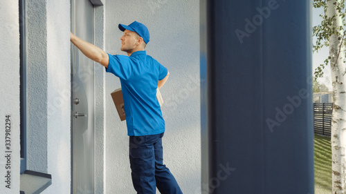 Delivery Man Holding Card Board Package and Knoks to the House. Delivering Postal Parcel. In the Background Beautiful Suburban Neighbourhood. Side View