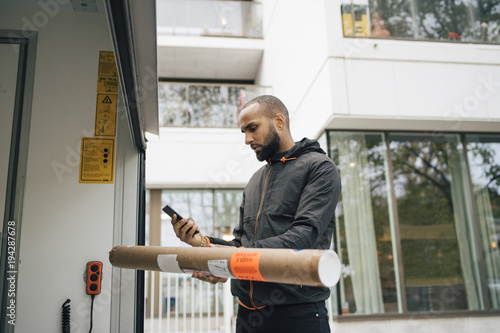 delivery, courier, work, package, mail, man, mixed race, adult, mid, phone, mobile phone, mobile phone, smartphone, communication, use, outdoors, day, 1, alone, people