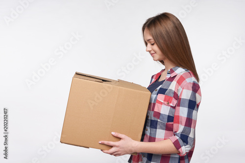 adult, box, brunette, cardboard, carry, casual attire, caucasian, chequered, cheerful, container, copy space, deliver, delivery, dispatch, distribution, dwelling, female, girl, happy, holding, isolated, lady, moving, 1, package, cardboard box, packing, person, positive, pretty, profile, relocation, service, shipping, shirt, half face, smile, standing, studio, teenage, teenage, teenage, woman, young, gift, present, expectation, brown