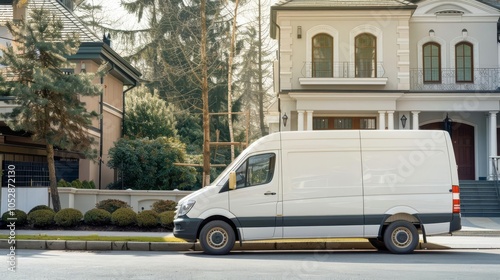Delivery service van parked in front of a residential home, ready for package delivery with copy space