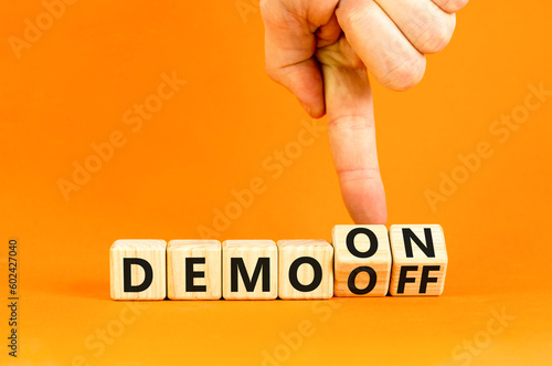 Demo on or off symbol. Businessman turns wooden cubes and changes word Demo off to Demo on. Beautiful orange table orange background. Business and demo on or off concept. Copy space.