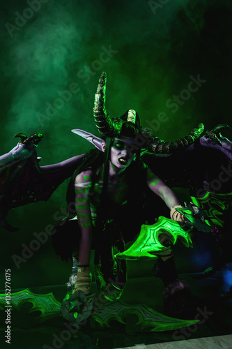 Demon Hunter Demon Cosplay on Black Background in Green Light