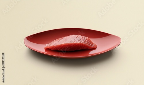 Dense and lean tuna fillet presented on a smooth red plate against a muted light yellow background