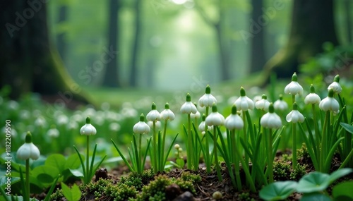 Dense clusters of wild garlic sprouts in a misty forest glade, landscape, allium ursinum