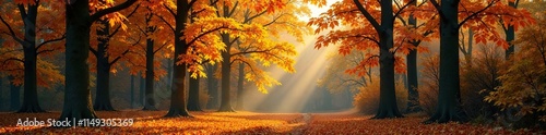 Dense forest of beech trees with golden autumn leaves, beech, landscape, autumn