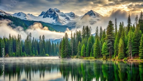 Dense forest of evergreen trees with snow-capped peaks, misty atmosphere and a serene lake in the background, nature, serenity, wilderness, natural beauty, mountain scenery