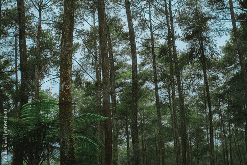 Dense forest of tall trees, suitable for nature backgrounds, environmental concepts, forestry, travel magazines, or outdoor adventure designs.