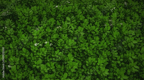 Dense Green Foliage Background with Small White Flowers