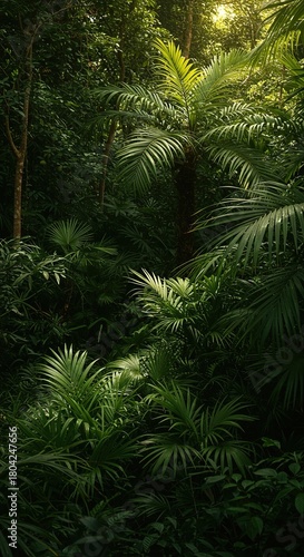 Dense tropical foliage glows with warm summer light, showcasing vibrant green plants and a humid, natural ecosystem. Serene jungle scene ,dense ,environment ,fresh