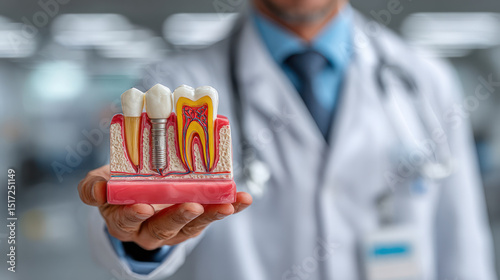 Dental anatomy model held by doctor showing tooth structure and implant for dental care and medical education.