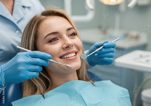 Dental checkup, young woman smiling, dental chair, dentist's office, blue medical gown