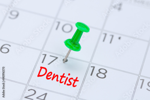 Dentist appointment date on a calendar with a green push pin to remind you and important appointment.