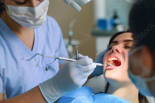 Dentist examining a patient's teeth with dental instruments in a clinic. The patient is lying back with mouth open, while the dentist is focused on the procedure.