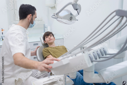 dentist, patient, man, mid, adult, boy, children, preteen, caucasian, chair, to sit, look, clinic, treatment, machine, machinery, health care, medicals, oral, dental, science, skill, expertise, lifestyle, togetherness, scrub, casual attire, indoor, day, 2, pair, people