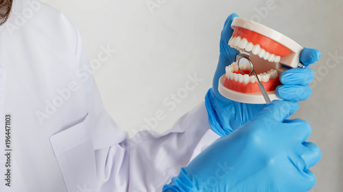 dentist, dental, teeth, jaw, model, anatomical, demonstration, tool, probe, explorer, glove, hand, dentistry, medicals, clinic, health care, hygiene, oral, care, treatment, check-up, prevention, anatomy, orthodontic, prosthetic, blue, white, background, copy space, education, professional, doctor, hospital, medicine, healthy, procedure, instrument, stomatologist, practitioner, workspace, clinical, closeup, denture, gum, health, office, service, technique, learning