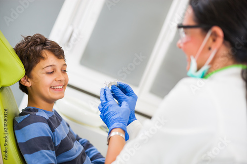 dentist, braces, teaching, explaining, denture, examining, checking, teeth, patient, boy, dental, children, little, talking, holding, health care, medicine, doctor, doctors office, happy, smiling, cheerful, equipment, closeup, mouth, hygiene, health, professional, woman, adult, caucasian, looking, male, female, indoor, two people