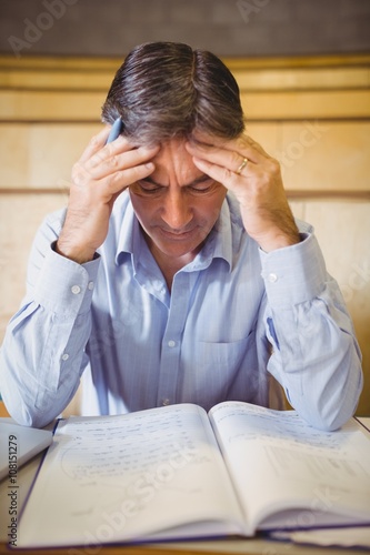 Depressed professor sitting with notes at desk