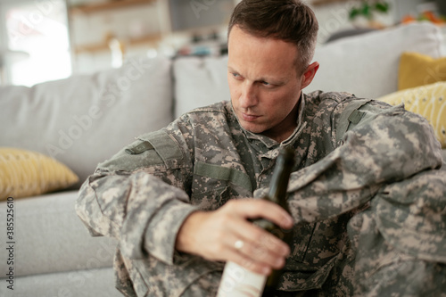 Depressed soldier with bottle sitting in living room. Alcohol addiction..
