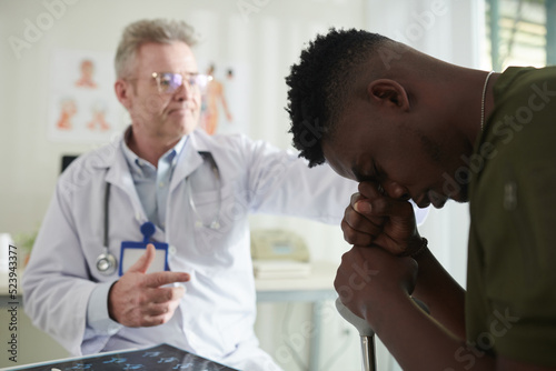 Depressed young African American soldier with walking stick suffering from PTSD visiting psychotherapist