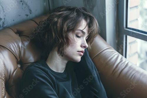 Depressed young woman in her twenties, sad and unhappy, sitting on a sofa. Break-up sadness.