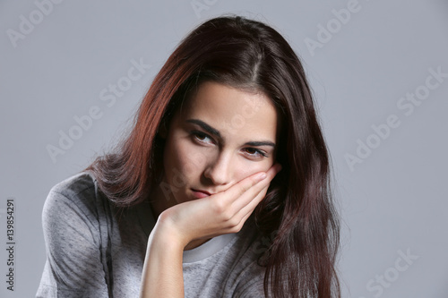 ache, alone, background, care, caucasian, colours, dental, dentist, depressed, depression, despair, desperate, difficulty, doctor, emotional, emotion, expression, female, frustrated, girl, grey, hand, health, hopelessness, loneliness, lonely, medic, medicals, medicine, melancholy, mental, pain, person, portrait, problem, regret, sad, sorrowful, stress, thinking, sleepy, teeth, toothache, trouble, unhappy, upset, woman, worried, worry, young