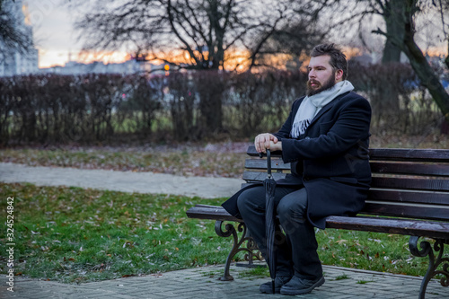 depressive concept photography of single bearded middle adult man portrait sit on a bench in black coat with umbrella and looking side ways in evening park with bare trees branches