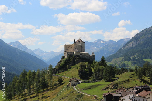 Der Blick auf das Schloss Tarasp im Engadin in der Schweiz