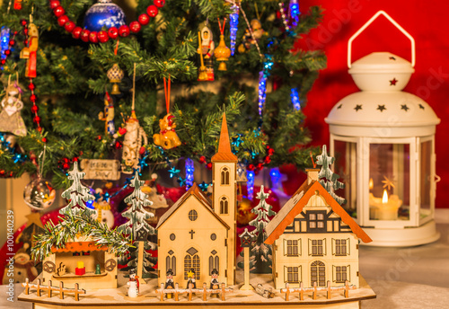 Деревянные игрушечные домики на фоне новогодней елки с фонарем со свечой.