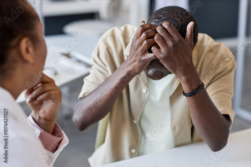 Dermatologist consulting male patient in clinic with African American man demonstrating skin rash on head copy space