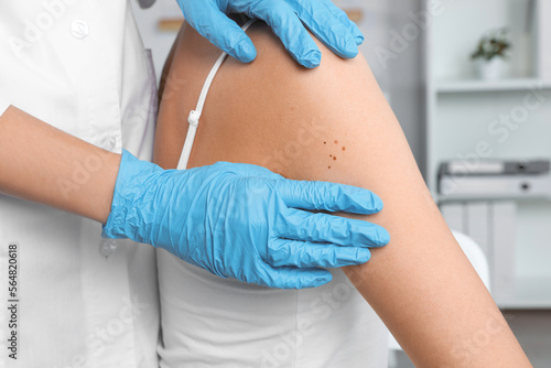 Dermatologist examining patient's birthmark in clinic, closeup