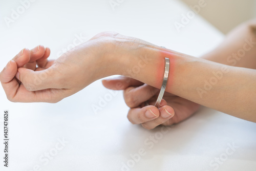 Dermatology asian young woman, girl allergy, allergic reaction dermatitis from wrist bracelet, jewelry on arm, hand in scratching itchy, itch red spot or rash of skin. Healthcare treatment beauty