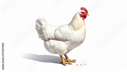 Describe a white chicken with red comb and wattles, yellow legs, and well-defined feathers, pecking at grains on a white background. Highlight its healthy appearance and relevance to poultry farming.