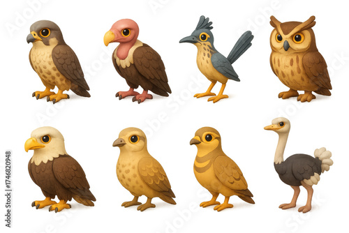 desert, bird, icon, animal, bird, set, three-dimensional, colours, style, hawk, vulture, roadrunner, owl, eagle, kestrel, ostrich