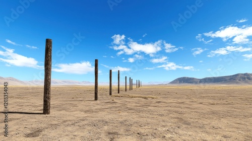 desert, landscape, arid, dry, barren, post, fence, horizon, sky, blue, cloud, sun, day, heat, sand, ground, brown, tan, remote, isolated, distance, huge, expanse, scenic, view, nature, travel, adventure, exploration, environment, geography, geology, climate, weather, texture, pattern, line, vertical, composition, photo, image, photo, picture, still, wide, shot, panorama