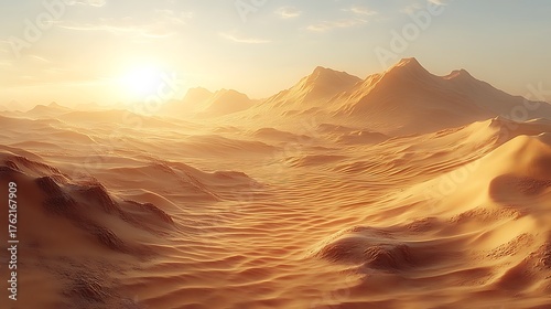 desert, sand, dune, mountain, landscape, sunrise, light, gold, warm, sun, horizon, nature, environment, travel, adventure, beauty, golden hour, sandstorm, arid, texture, huge, wide, panorama, empty, colours, sunset, golden light, color photography, photographic, image, background, design, illustration, copy space, isolated, digital artwork, graphic
