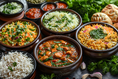 Desi Indian traditional dining set top view of Pizza, hummus, biryani, chicken currii, moomos, tikka, Qorma, samosa High quality photo