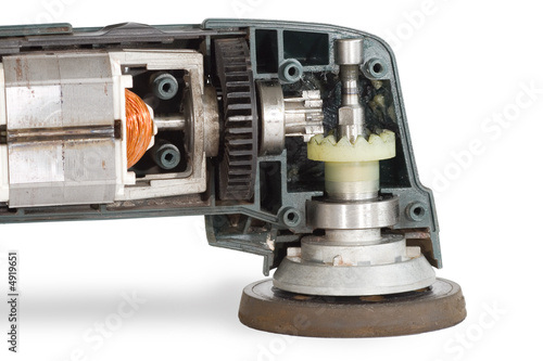 tool, instrument, implement, workshop, construction, work, grinding, dust, device, metal, instruction, men at work, skill, engineer, constructor, assistant, master, section, profile, electronic, electric motor, reducer, isolated, macro, white background, hold, interior, shaft, only, object, platform, force, power, plastic, bearing