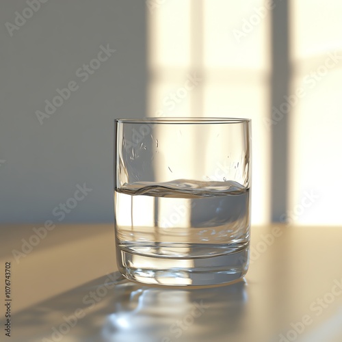 Design a digital rendering of a crystal-clear, refreshing glass of water, capturing the play of light and shadow to evoke a sense of cool hydration